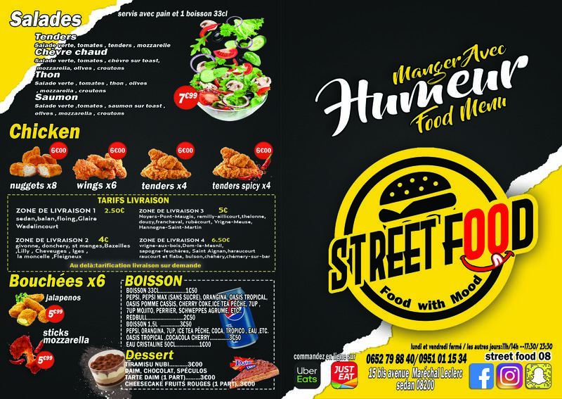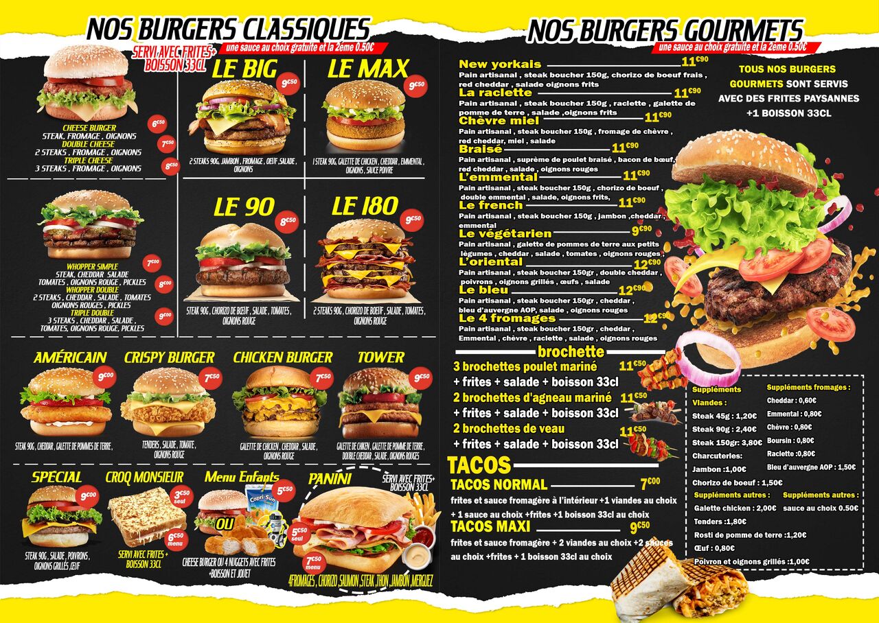 burgers, tacos, salades, frites ,grillades.